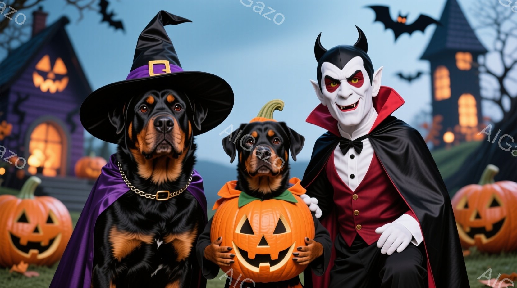3匹のロットワイラーがハロウィーンの衣装を着て並んでいます。左の犬は紫色の魔女帽子をかぶり、真ん中の犬はジャック・オー・ランタンの衣装を着ており、一番右の犬は黒いマントと蝶ネクタイを身に着けています。背景には、不気味な屋敷、カボチャ、そして夜空に飛ぶコウモリが見え、全体的にハロウィーンの楽しい雰囲気が漂っています。
