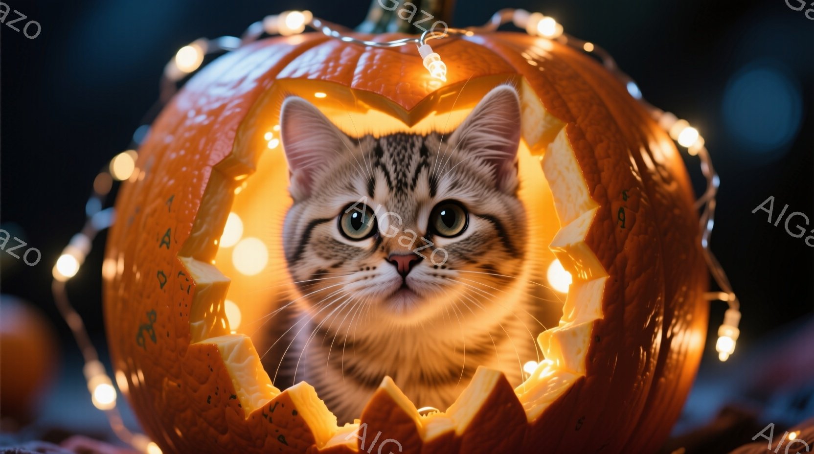 彫刻されたハロウィーンカボチャの中から、灰色の毛並みの猫が前足を伸ばしてこちらを見つめています。カボチャの内側は暖かく輝くオレンジ色で、猫の表情は好奇心と少しのいたずらっぽさを示しています。背景にはぼんやりとした光がちらつき、お祝いムードを演出しています。