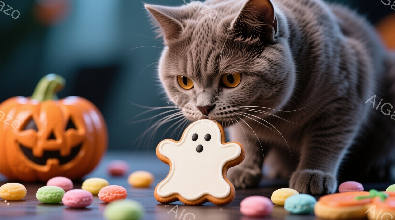灰色の毛並みの猫が、ハロウィーンのクッキー(お化けの形)に鼻を近づけています。背景には、カラフルなキャンディーと、ジャック・オー・ランタンがいくつか配置され、ハロウィーンの雰囲気を盛り上げています。猫の表情は好奇心旺盛で、クッキーを少しずつ味わおうとしている様子が伺えます。
