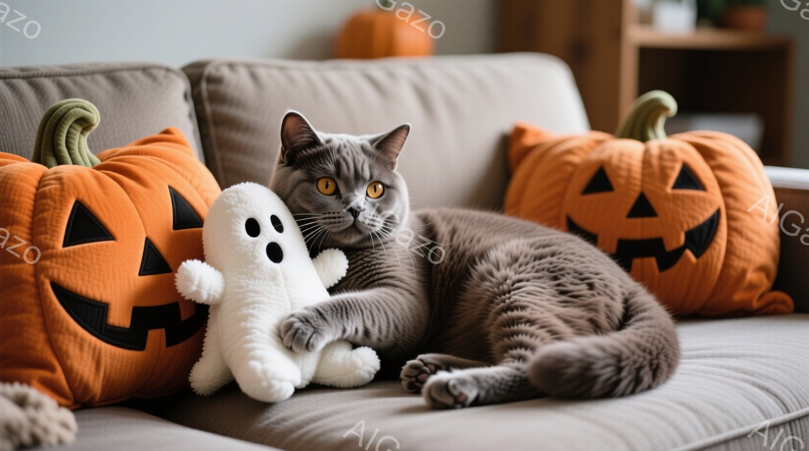 灰色の猫が、ハロウィーンをテーマにしたオレンジ色のジャック・オー・ランタンのクッションと白いゴーストのぬいぐるみに寄り添って、灰色のソファにゆったりと横たわっています。猫は鮮やかな黄色の目をしており、リラックスした表情でカメラを見つめています。背景には、ぼやけた家具や植物が見え、暖かく、居心地の良い雰囲気が漂っています。
