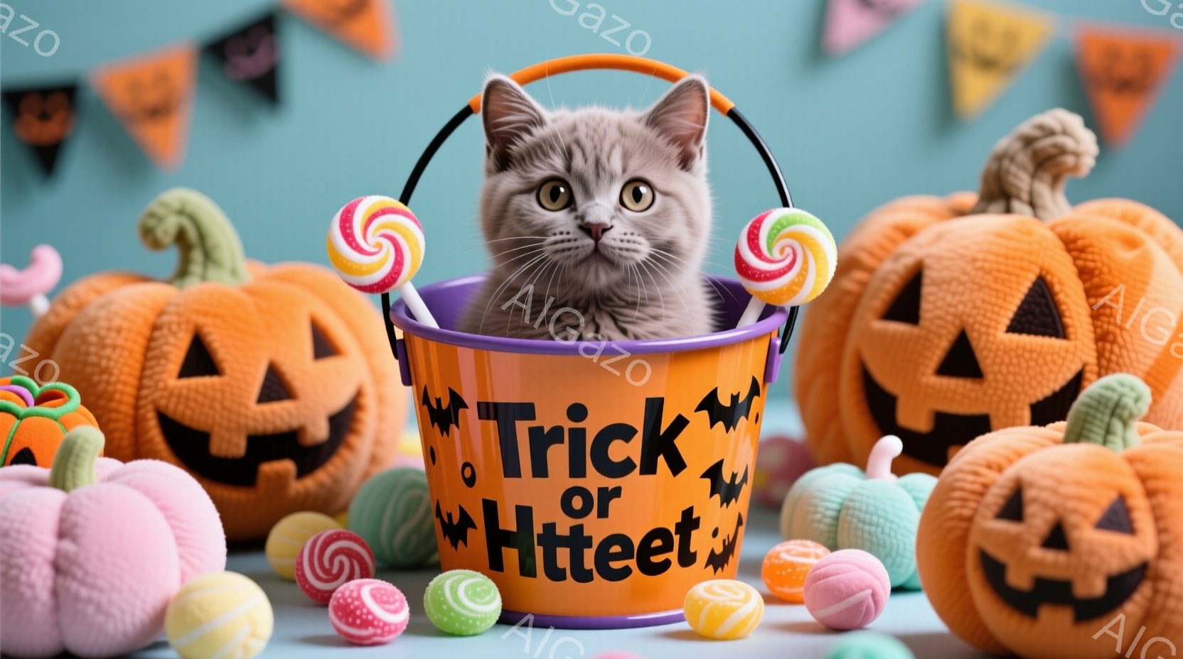 オレンジ色のハロウィーンのバケツの中に、縞模様の子猫が可愛らしく顔を出しています。周りには、さまざまなカラフルなキャンディーと、不気味な笑顔で彫られたジャック・オー・ランタンが並び、ハロウィーンの楽しい雰囲気を盛り上げています。背景には、紫色のガーランドが見え、全体的に温かく、遊び心溢れる光景が広がっています。