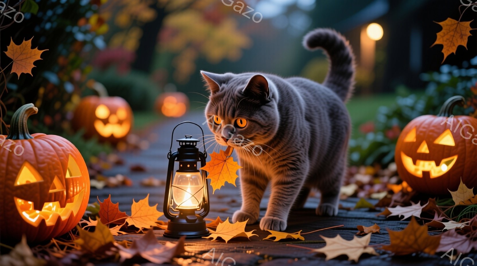 庭の小道に、ハロウィーンの飾りであるジャック・オ・ランタンと紅葉が散らばり、グレーの猫が正面を見て歩いている。猫は静かに前進し、その目は光を反射して輝いている。背景にはぼやけた建物と木々があり、秋の夜の穏やかで幻想的な雰囲気が漂っている。