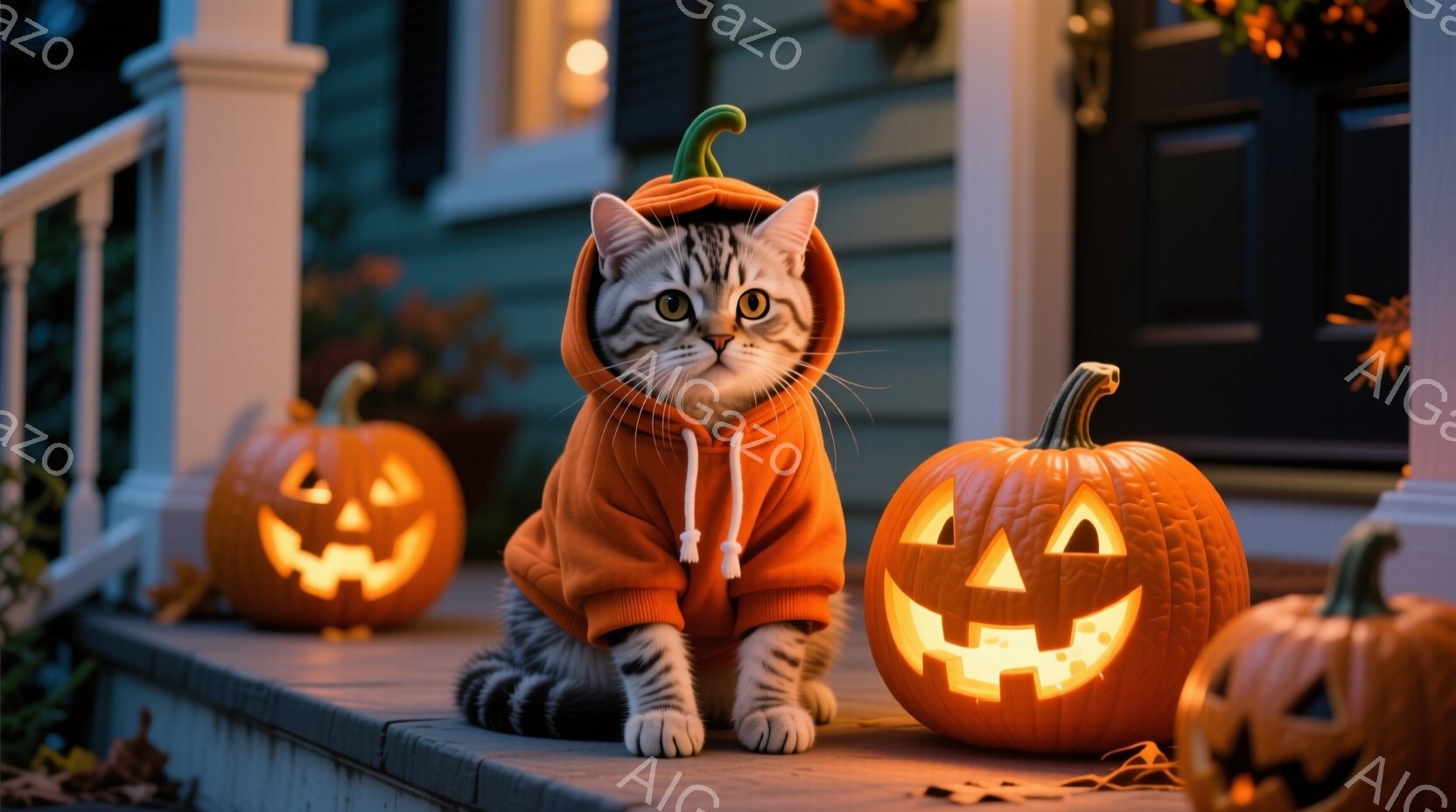 オリジナルのHalloweenテーマを持つ写真です。中心に座った、対面から見る可能性があるオレンジ色の猫が、シャベックス状のコスチュム(「オレンジ」と表示されています)を着用しています。猫は興味深い眼で周囲を見つめ、手が揃ったのに足は分かれているような状態にあります。 組み合わせとして、猫の冷静さとポップアートの調和が印象的であり、視聴者に慎重なホロウィン団体を感じることができます。