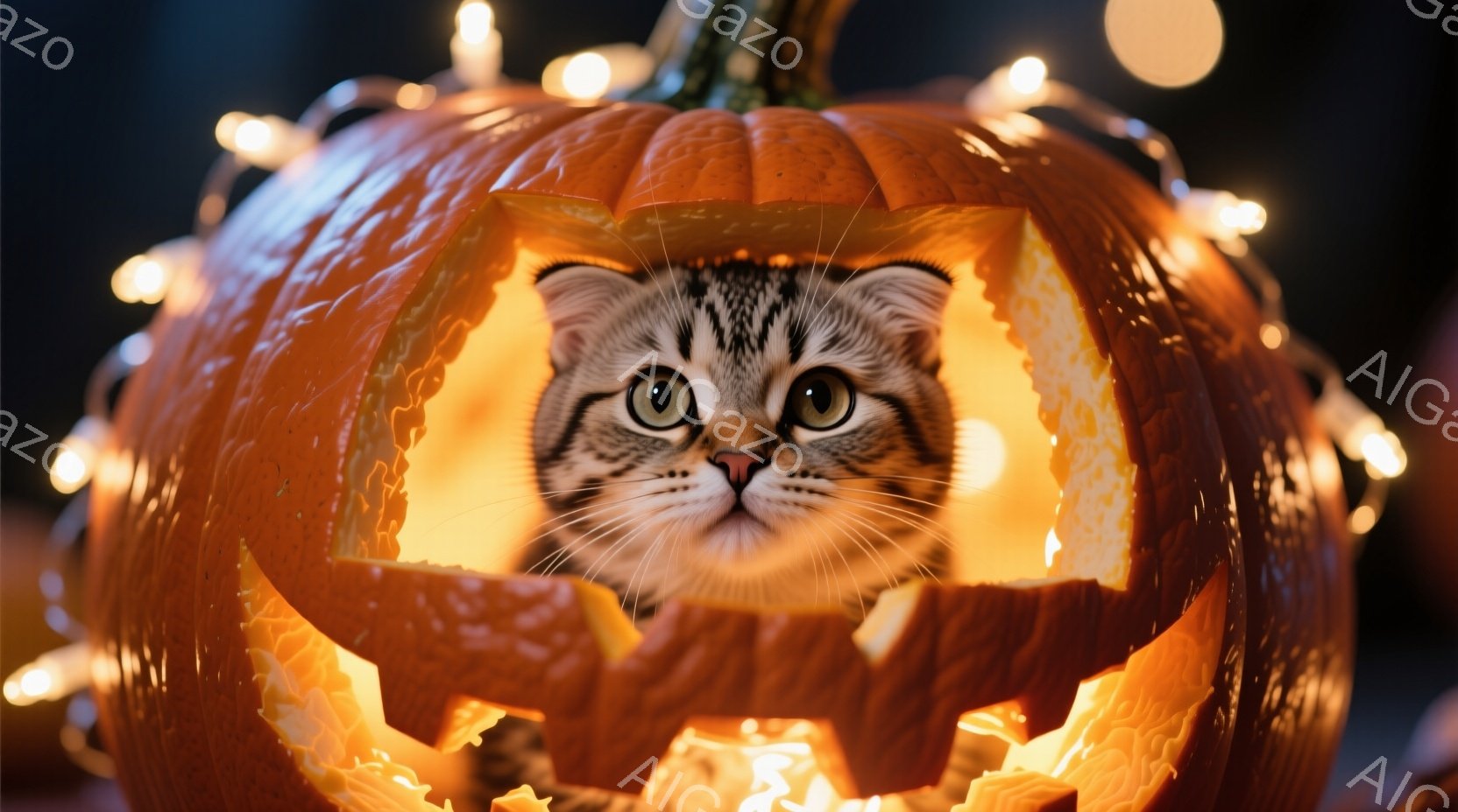 縞模様の猫が、ハロウィーンのくり抜かれたカボチャの中に顔を出しています。カボチャの内側はオレンジ色に光っており、猫の顔を照らしています。背景にはぼやけた光の列があり、全体的に温かく、遊び心のある雰囲気を醸し出しています。