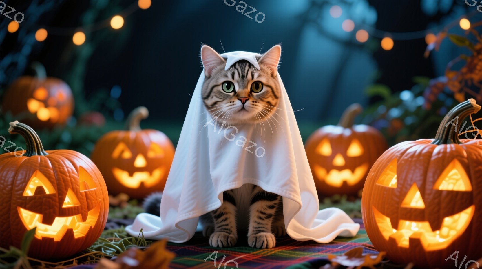 この無料AI生成画像「ハロウィーンをテーマにした画像で、2匹の猫と骸骨が描かれています。片方の猫はカボチャの衣装を着て提灯を持ち、もう片方の猫は魔女の帽子とマントを身につけて提灯を持っています。背景には、提灯、カボチャ、そして暗い夜空が描かれ、不気味で楽しいハロウィーンの雰囲気を醸し出しています。」は、2025年10月25日に作成されました。 サイズは 1664×928px の高解像度で、商用利用も可能なフリー素材として提供しています。