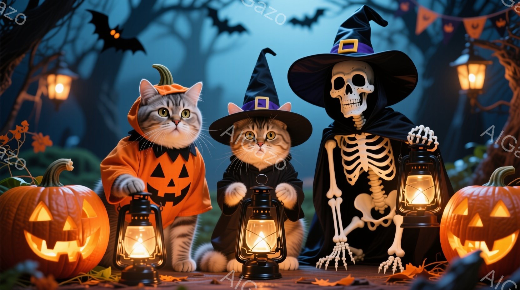ハロウィーンをテーマにした画像で、2匹の猫と骸骨が描かれています。片方の猫はカボチャの衣装を着て提灯を持ち、もう片方の猫は魔女の帽子とマントを身につけて提灯を持っています。背景には、提灯、カボチャ、そして暗い夜空が描かれ、不気味で楽しいハロウィーンの雰囲気を醸し出しています。
