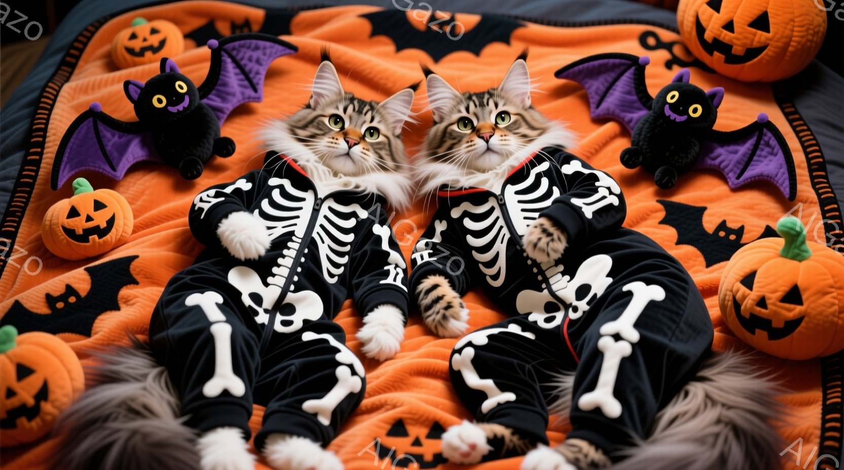 オレンジ色の背景に、骸骨の衣装を着た2匹の猫が横たわっています。片方の猫は少し足を伸ばし、もう片方の猫は足を曲げてリラックスした様子で、どちらも可愛らしい表情をしています。背景にはハロウィンの飾り、例えばカボチャやコウモリのぬいぐるみが散りばめられており、お祝いムードを演出しています。