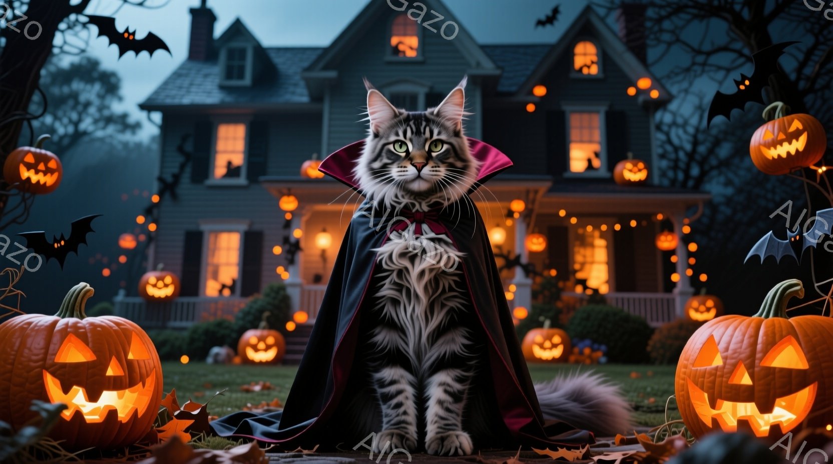 夜のホラー風のハロウィンのシーンを表しています。中央には、長毛の猫が座っており、その猫は特別なコスチュームを着ており、血まみれの布で覆われ、「吸血鬼」というキャラクターに似ています。猫は細く優雅なポーズを取っており、前足を交えるように引き下げています。 全体的な雰囲気は、ホラーとコメディを融合したような印象を与えるでしょう。演出はユニークで、猫が人間のキャラクターに扮装していることが特徴的です。