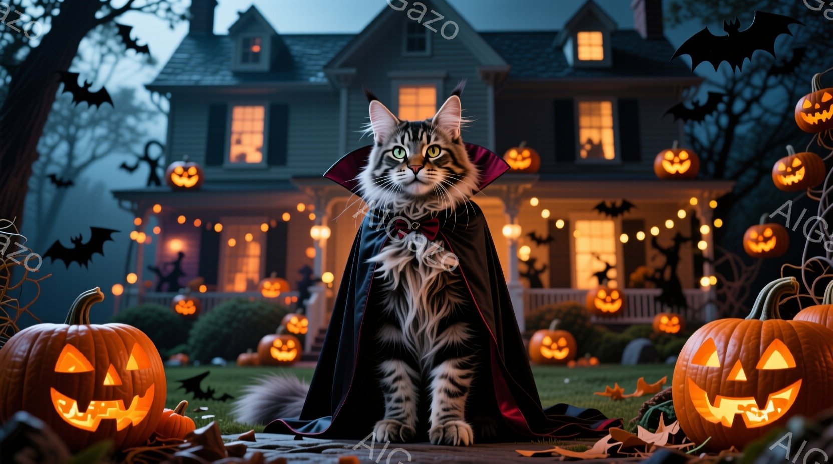 縞模様の猫が、黒いマントと赤い襟をつけて座っており、ハロウィーンの衣装を着ています。背景には、オレンジ色のジャック・オー・ランタンや飾り付けられた家があり、夜空にはコウモリが舞っています。全体的に、ハロウィーンの夜の少し不気味で楽しい雰囲気が漂っています。