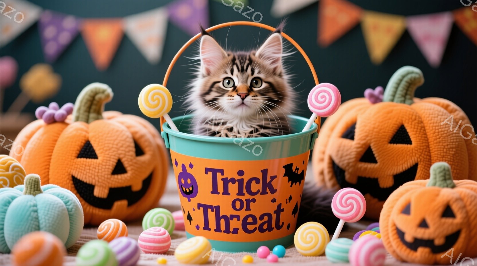 小さなキジトラの子猫が「トリック・オア・トリート」と書かれたオレンジ色のバケツの中に座っています。周囲にはハロウィーンの装飾であるカボチャの形のキャンディやオレンジと水色のストライプのキャンディ、そして可愛らしいカボチャの置物がたくさん並んでいます。背景にはハロウィーンのガーランドや写真が飾られ、全体的に明るく可愛らしい、ハロウィーンの雰囲気に満ちています。