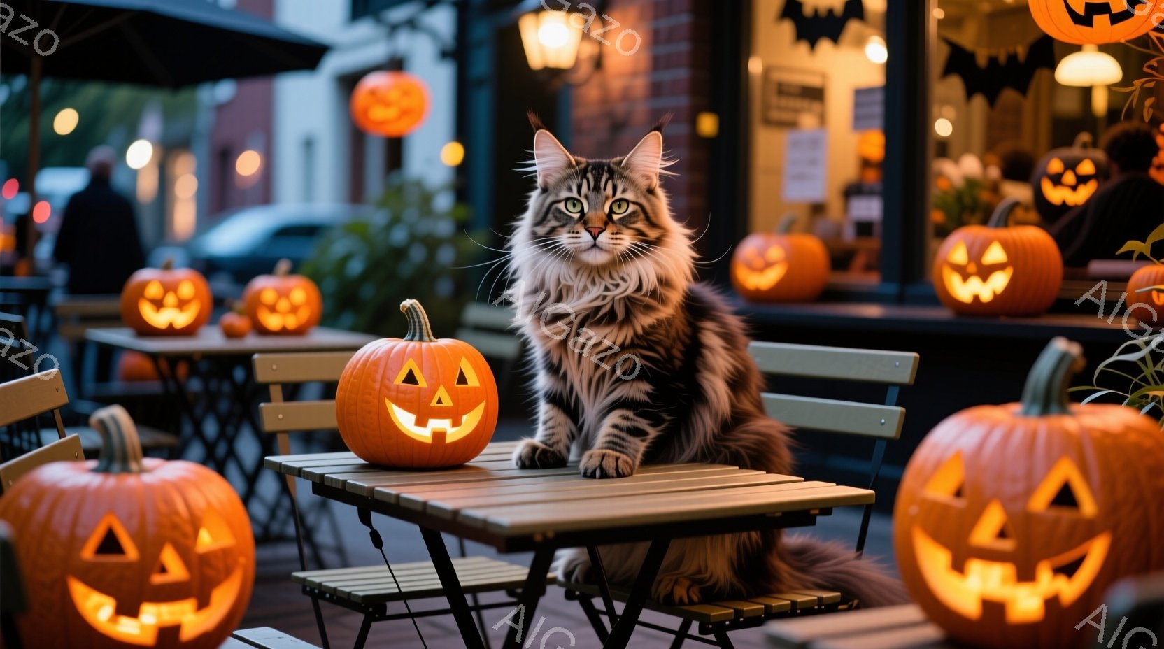 長毛の灰色の猫が、ハロウィーンのランタンで飾られた屋外カフェのテーブルに座っています。ランタンは鮮やかなオレンジ色に光り、猫の周りを照らし出しています。背景にはぼやけた建物と植物があり、暖かい光がハロウィーンの雰囲気を作り出しています。