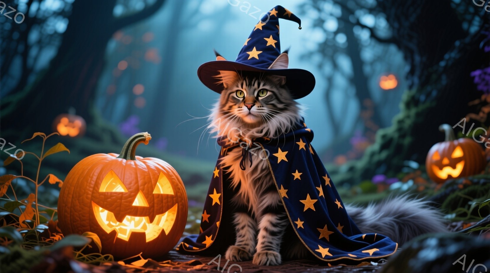 長毛の灰色の猫が屋外のカフェのテーブルに座って、正面を見つめています。背景には、ハロウィーンのランタンが飾られた建物やテーブルがあり、暖かく幻想的な雰囲気を醸し出しています。夜の街並みで、ハロウィーンの装飾が光り、秋の夜の静けさが感じられます。