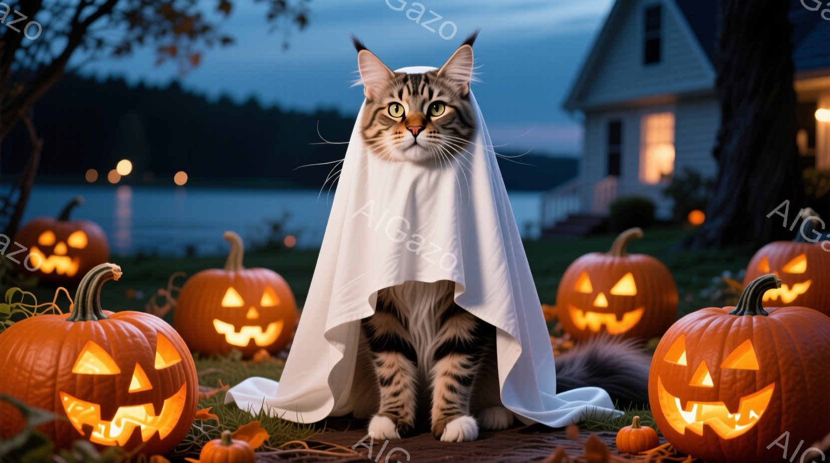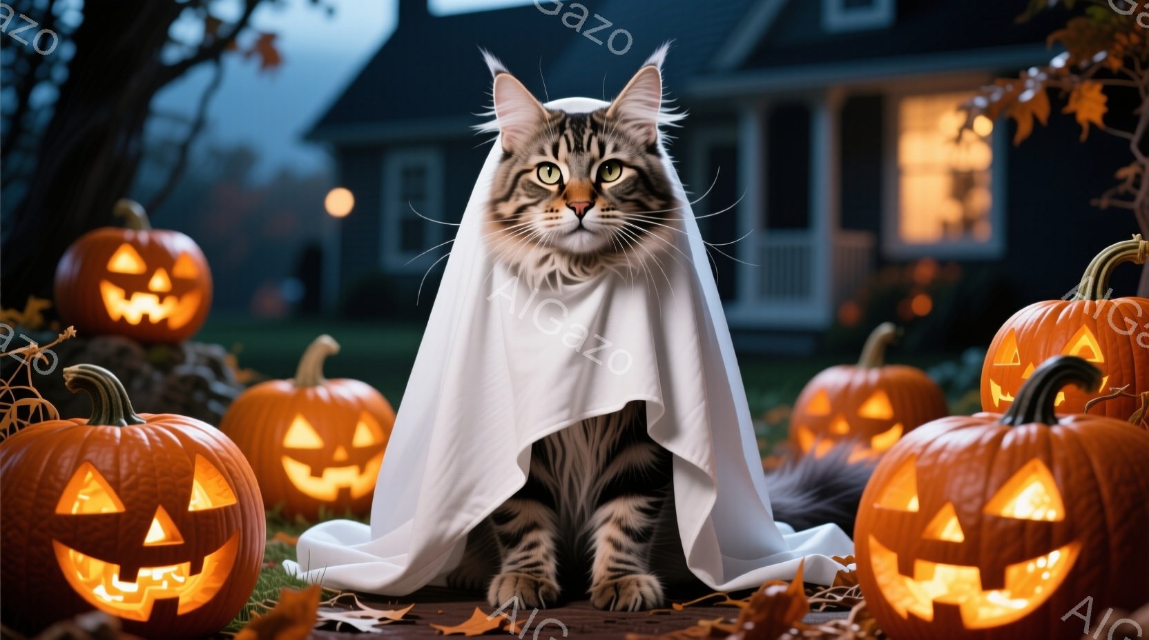 茶色の縞模様の猫が白い布をまとい、正面を見つめて座っています。猫の周りには、顔が彫刻されたオレンジ色のカボチャがいくつか配置され、背景にはライトが点灯した家が見えます。全体的にハロウィーンの夜の暖かく、お祝いの雰囲気です。
