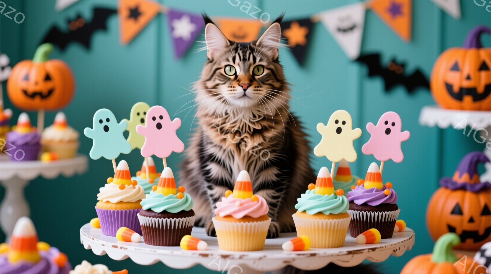 この無料AI生成画像「道路にはカボチャのランタンが並び、散りばめられた紅葉が秋の雰囲気を高めている。毛並みの美しい縞模様の猫が、点灯したランタンの近くを注意深く歩いている。背景にはぼやけた建物と木々が見え、穏やかで幻想的なハロウィーンの夜を思わせる。」は、2025年10月25日に作成されました。 サイズは 1664×928px の高解像度で、商用利用も可能なフリー素材として提供しています。