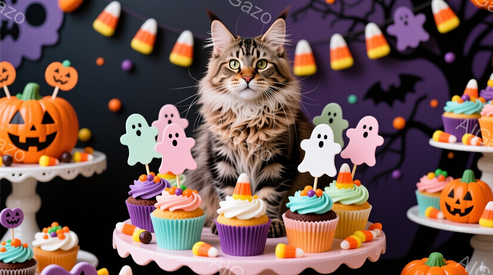 ストライプ柄の猫が、ハロウィーンをテーマにしたケーキの段の上に座っています。ケーキはピンク、紫、水色のアイシングで飾られ、お化けやコーンキャンディーのトッピングが施されています。背景には、カボチャのランタンとハロウィーンの旗、そしてオレンジ色のキャンディーが飾られ、お祝いムードが漂っています。