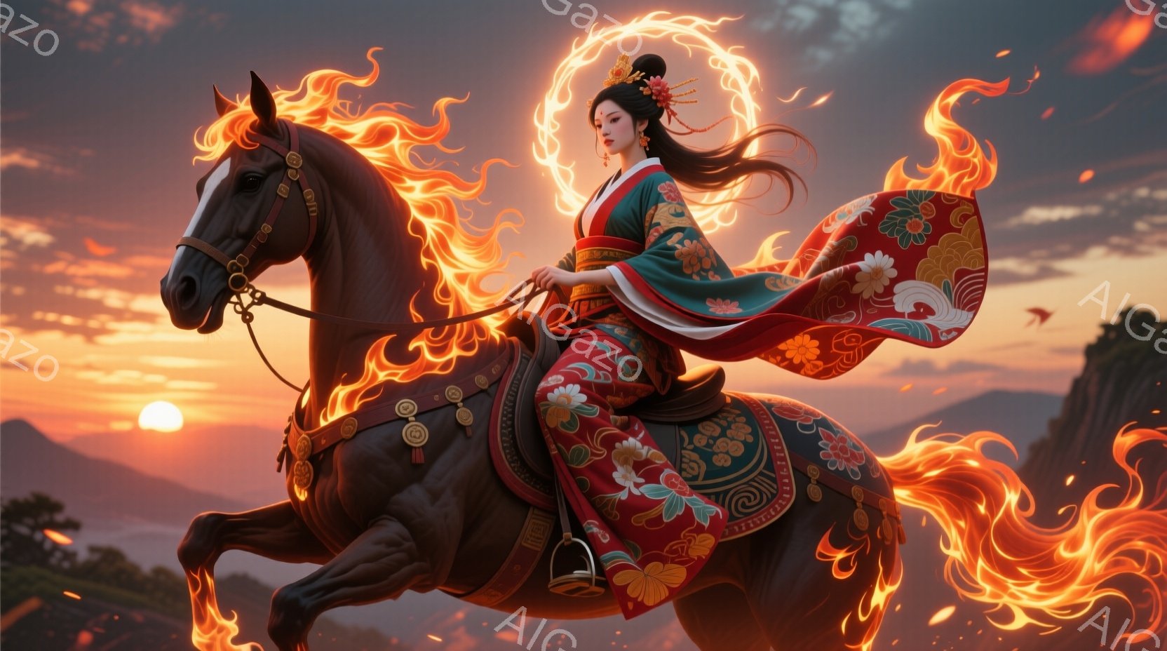 鮮やかな緑と金色の衣装を身に着けた女性が、燃え盛る鬣と体を持つ黒い馬にまたがっています。彼女は長い黒髪を後ろに解き、落ち着いた表情で前方を向いています。背景には夕焼け空と、霞んだ山々が広がり、燃え盛る馬と女性の姿を幻想的に際立たせています。