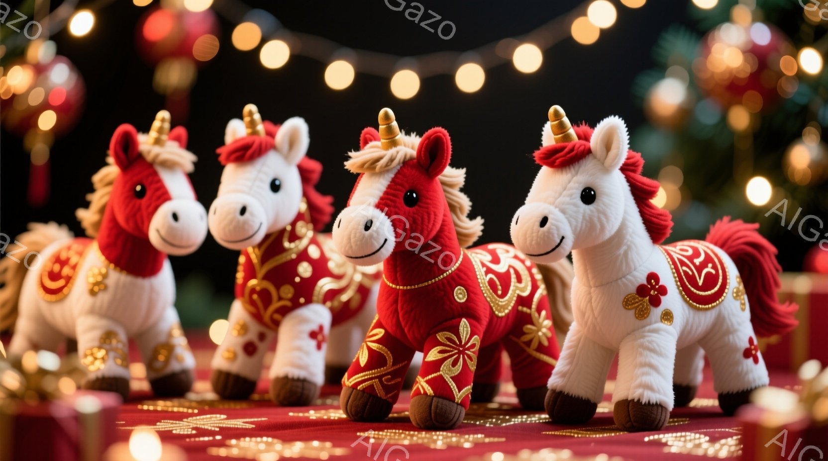 赤い模様の服を着たユニコーンのぬいぐるみたちが、赤いカーペットの上に並んでいます。彼らは皆、同じポーズで立っており、表情は穏やかで可愛らしいです。背景にはぼやけた光の装飾があり、お祝いの雰囲気を醸し出しています。