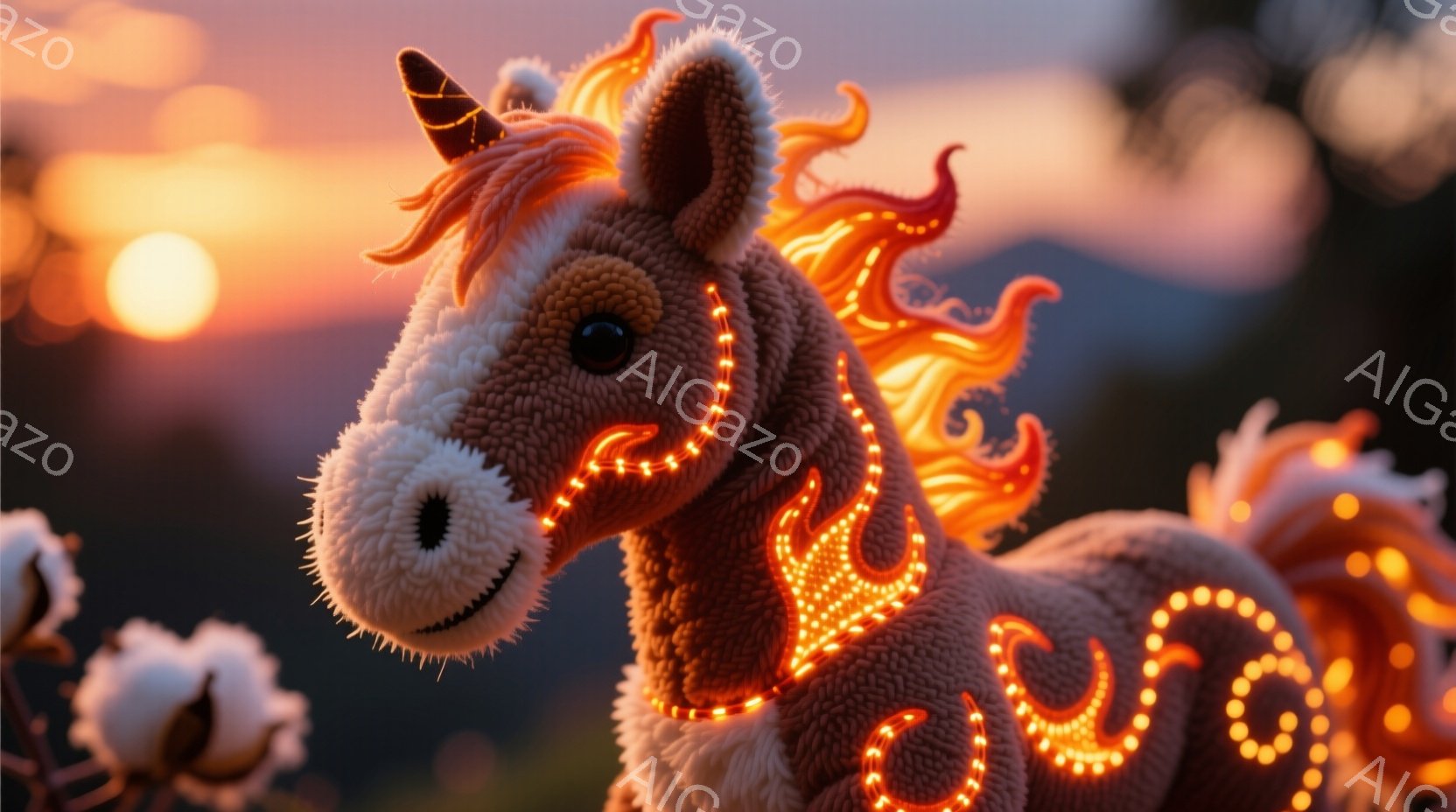 鮮やかな夕焼けを背景に、手編みのユニコーンが佇んでいます。オレンジ色の毛並みに、炎のような模様が施されており、たてがみが燃え盛るようにデザインされています。その表情は穏やかで、まるで夕焼け空の一部であるかのような幻想的な雰囲気を醸し出しています。