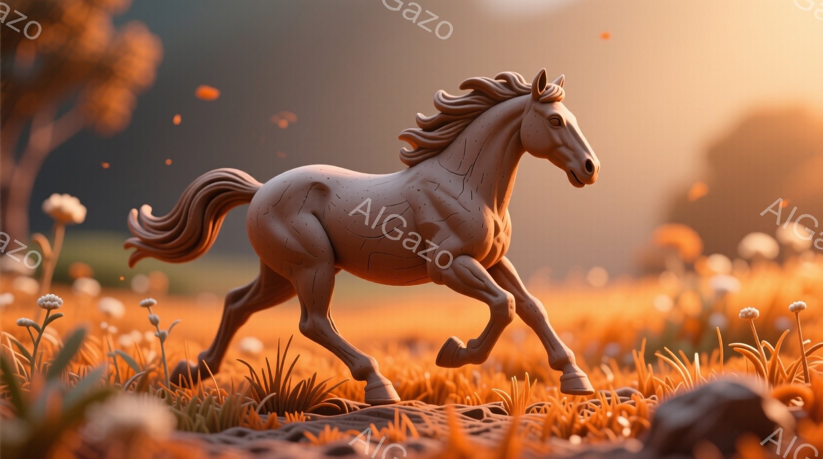 カラフルな模様のユニコーンのようなおもちゃの馬が、緑色の苔が生えた岩の上に立っている。背景にはオレンジと紫が混ざった夕焼け空が広がり、光が反射した小さな球体が地面に散らばっている。全体的に暖かく幻想的な雰囲気で、おとぎ話の世界のような情景が広がっている。