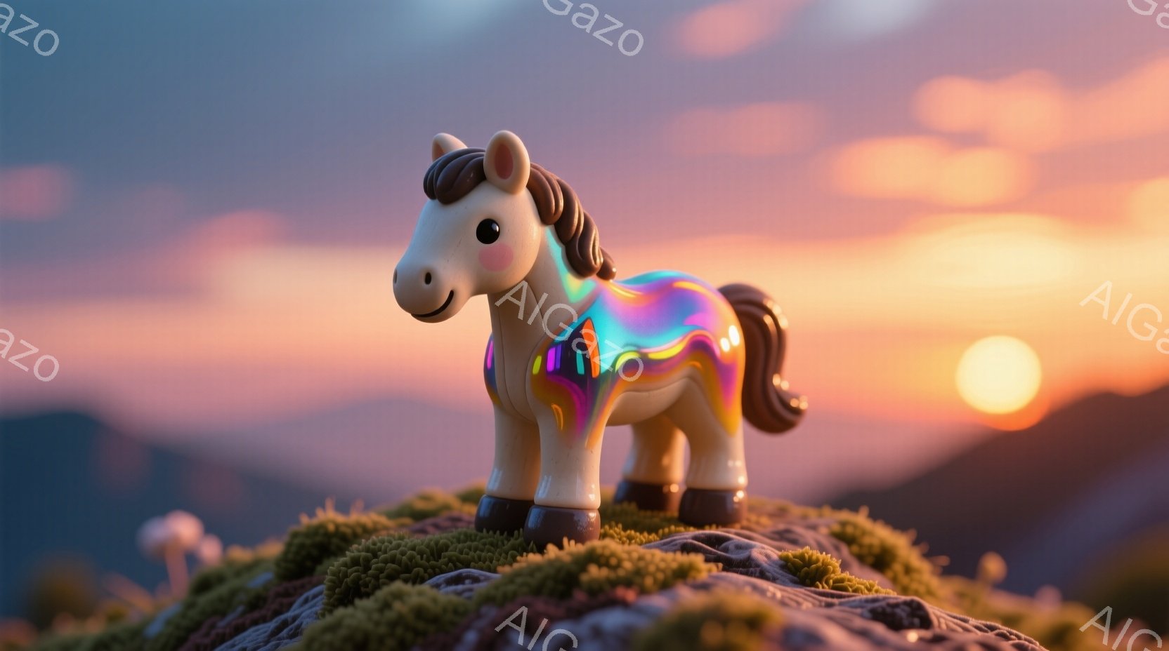 カラフルな虹色の馬が緑の苔の上に立っている。背景には、夕焼けのオレンジとピンクの空と、遠くに見える山々が広がっている。全体的に、幻想的で平和な雰囲気が漂っている。