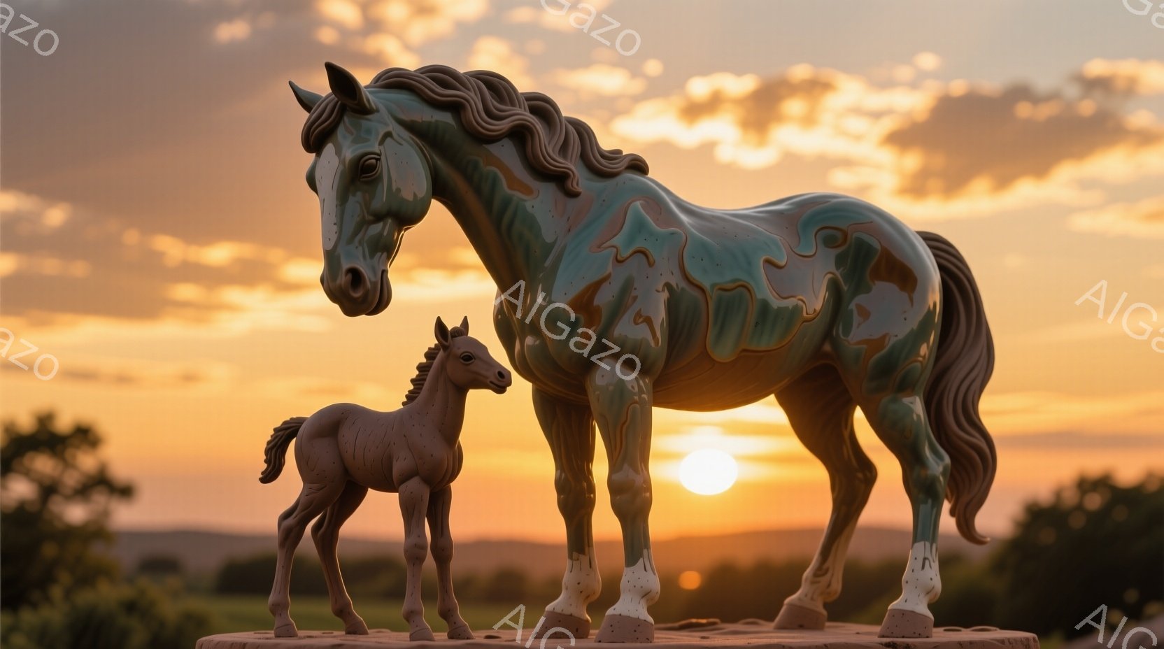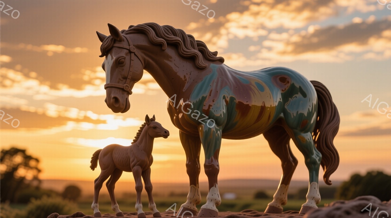 夕焼けを背景に、母馬と子馬が並んで立っている。母馬はエメラルドグリーンの毛並みで、たてがみは黒く、白く模様のある足元が印象的だ。子馬は明るい茶色で、母馬を見上げている様子から、愛情深い親子関係が感じられる。