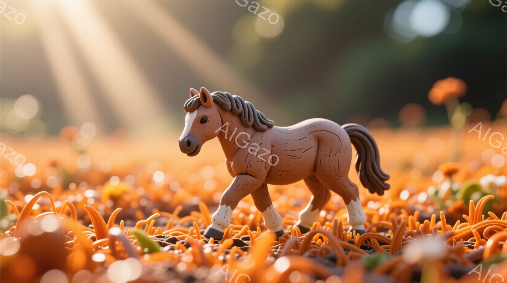 茶色い馬が、オレンジ色の植物が茂る地面の上を歩いている様子が描かれています。馬は左足を高く上げ、歩く動作をとっており、毛並みは滑らかで、日差しに照らされて温かい雰囲気です。背景はぼやけており、夕焼けのようなオレンジ色の光が差し込み、全体的に幻想的で穏やかな印象を与えます。