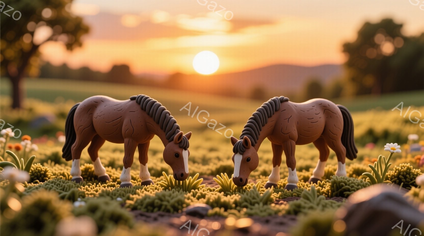 2頭の茶色の馬が緑豊かな草地で寄り添いながら草を食べている。背景には、夕焼けに照らされた穏やかな丘陵地帯と、遠くに見える木々が広がっている。全体的に、暖かく平和な、牧歌的な雰囲気を醸し出している。