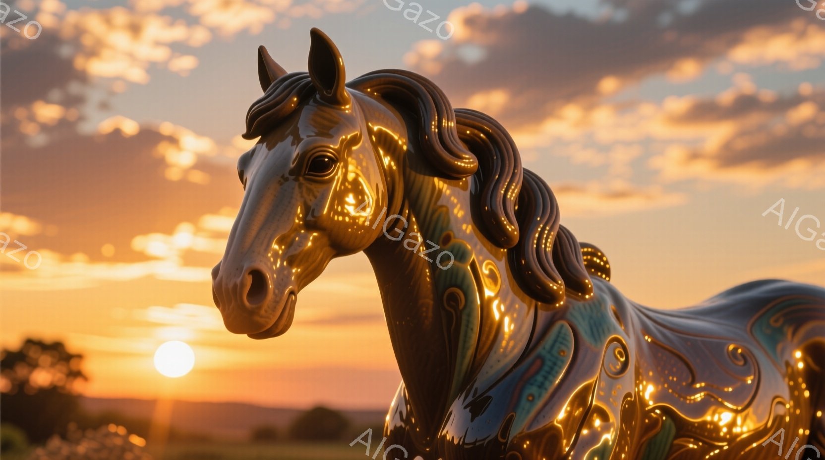 金色の彫刻のような馬が、緑の丘と夕焼けを背景に立っている。馬の体には複雑な模様が施され、太陽の光を反射して輝いている。背景の夕焼けはオレンジ色と赤色のグラデーションで、穏やかで幻想的な雰囲気を醸し出している。