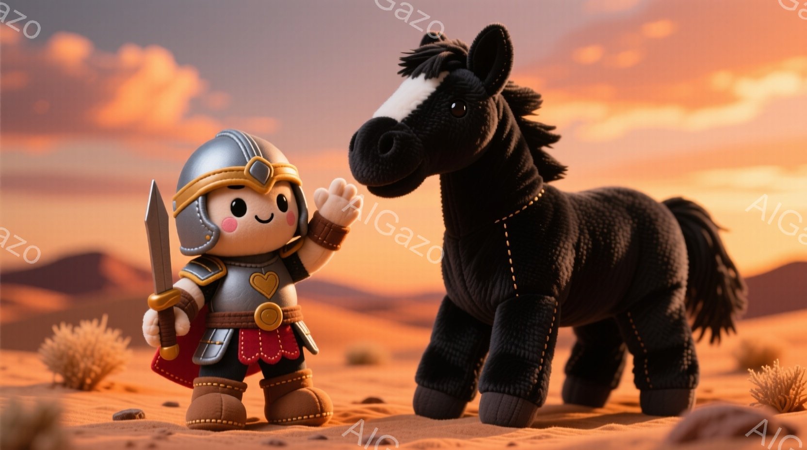 この無料AI生成画像「砂漠の中に立つローマ兵風の小さな人形と黒い馬が描かれています。人形はヘルメットをかぶり、赤い羽根飾りをつけて、笑顔で片手を上げています。背景には砂丘とまばらな低木が見られ、夕焼けのような暖色系の空が広がり、穏やかで幻想的な雰囲気を醸し出しています。」は、2025年10月25日に作成されました。 サイズは 1664×928px の高解像度で、商用利用も可能なフリー素材として提供しています。