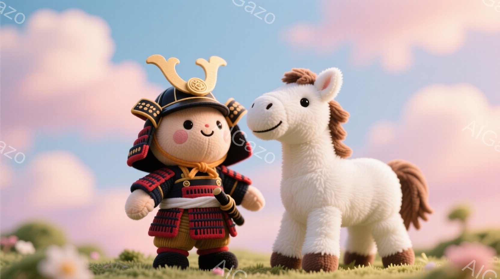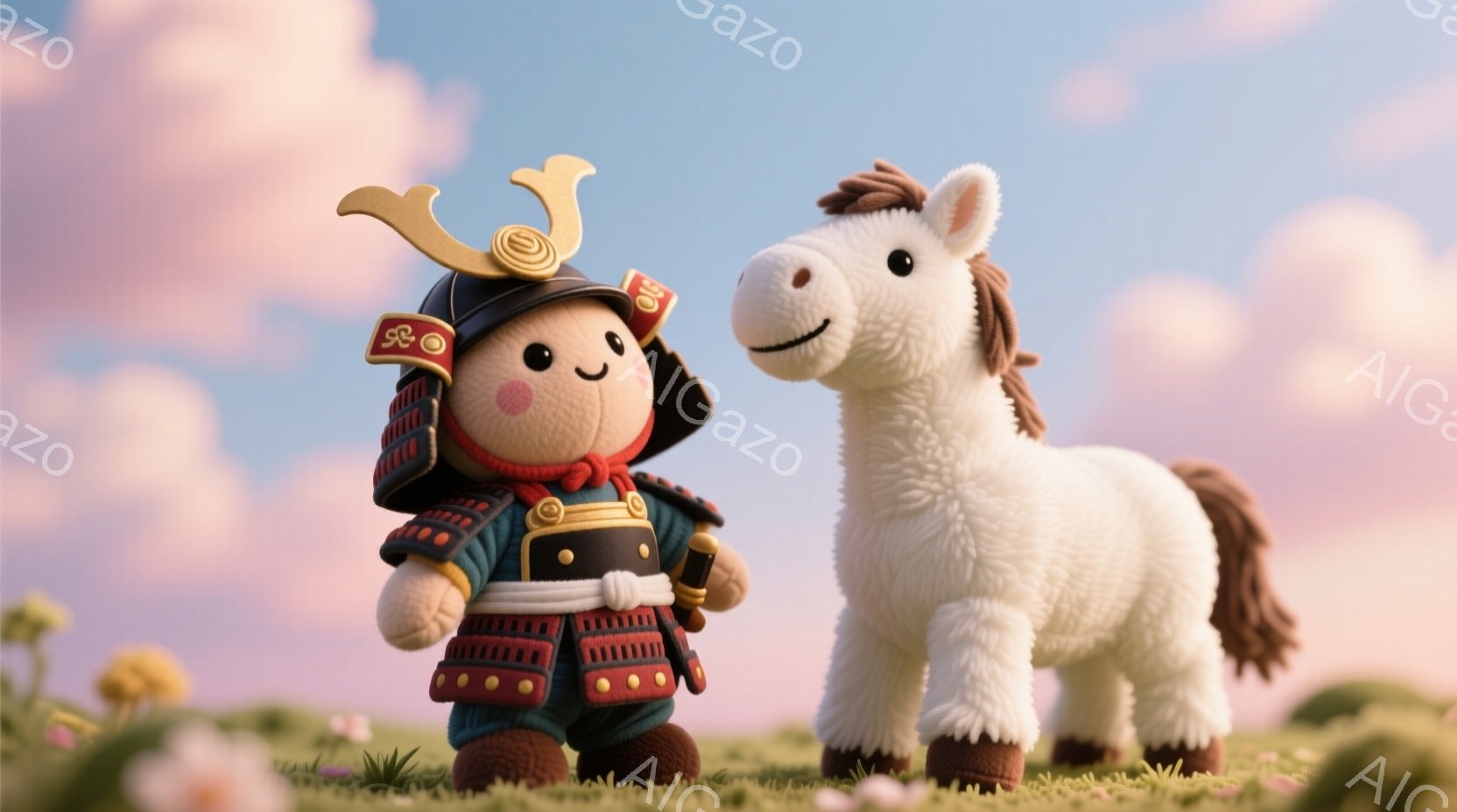 鮮やかなピンクと紫色の空の下、可愛らしい武士の姿をしたキャラクターが、伝統的な鎧を身に着け、小さな刀を帯びています。つぶらな瞳と微笑みを浮かべ、少しふっくらとした体型が特徴的です。背景には緑の草原が広がり、近くには白い馬が穏やかに立っており、全体的に温かく、優しい雰囲気が漂っています。