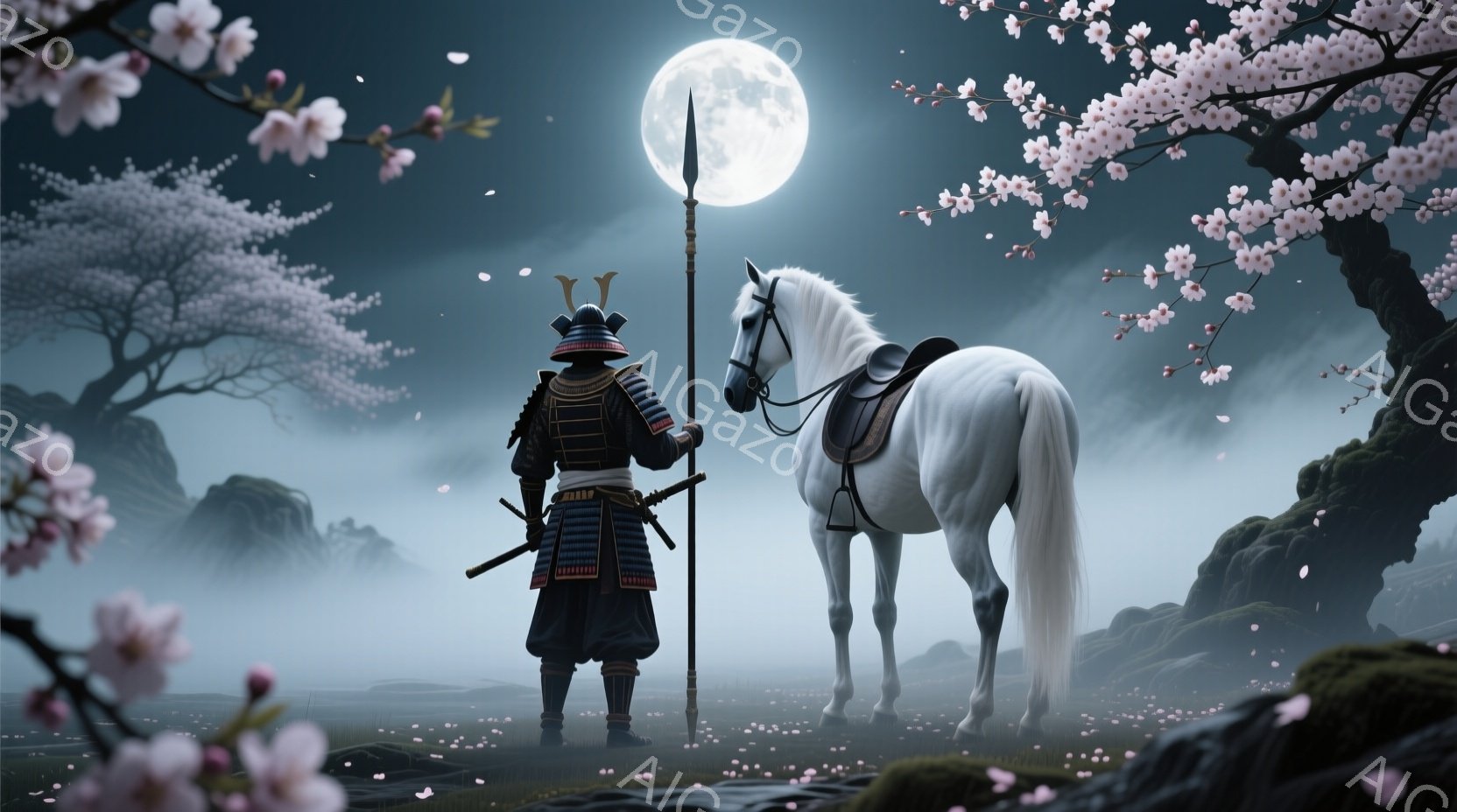 鎧を身に着けた武士が、水溜まりのある荒野に立ち、背中に長槍を担いでいます。背景には緑豊かな風景が広がり、激しい雨と稲妻が不気味な雰囲気を醸し出しています。白い馬が武士の隣に静かに立ち、共に嵐に立ち向かっているようです。