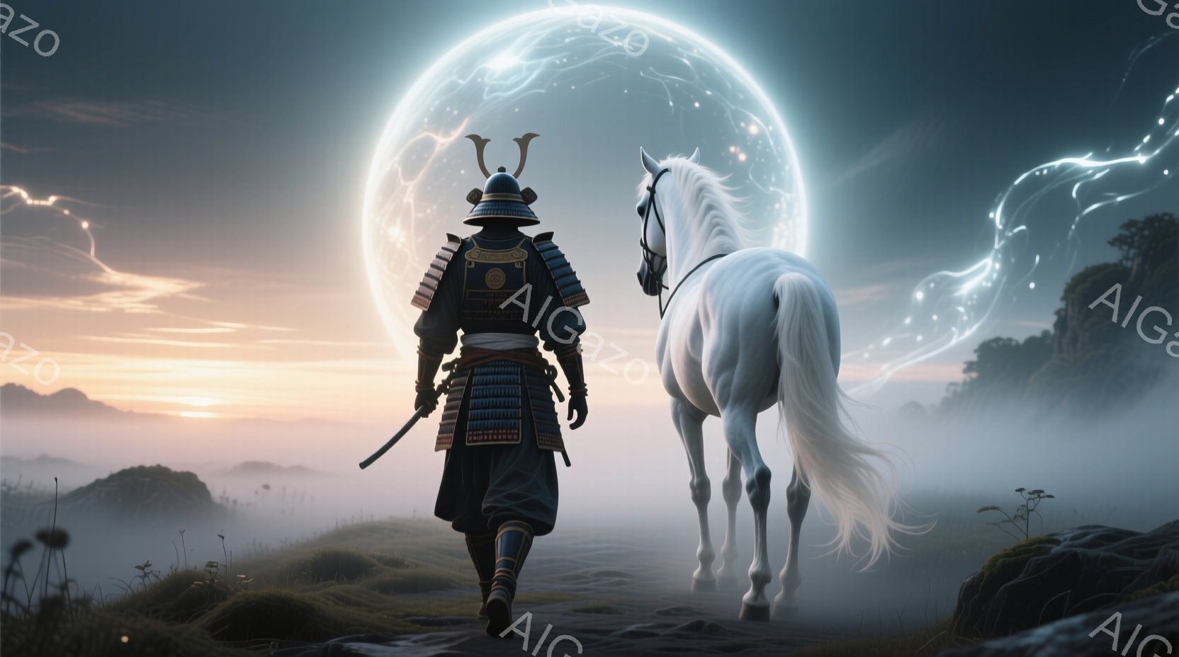 鎧を身につけた武士が、白い馬と共に霧深い丘を歩いている。背景には巨大な光輪のような円が浮かび、空には薄い雲が広がっている。 全体的に静かで神秘的な雰囲気が漂い、武士の背中は力強く、決意に満ちているように見える。