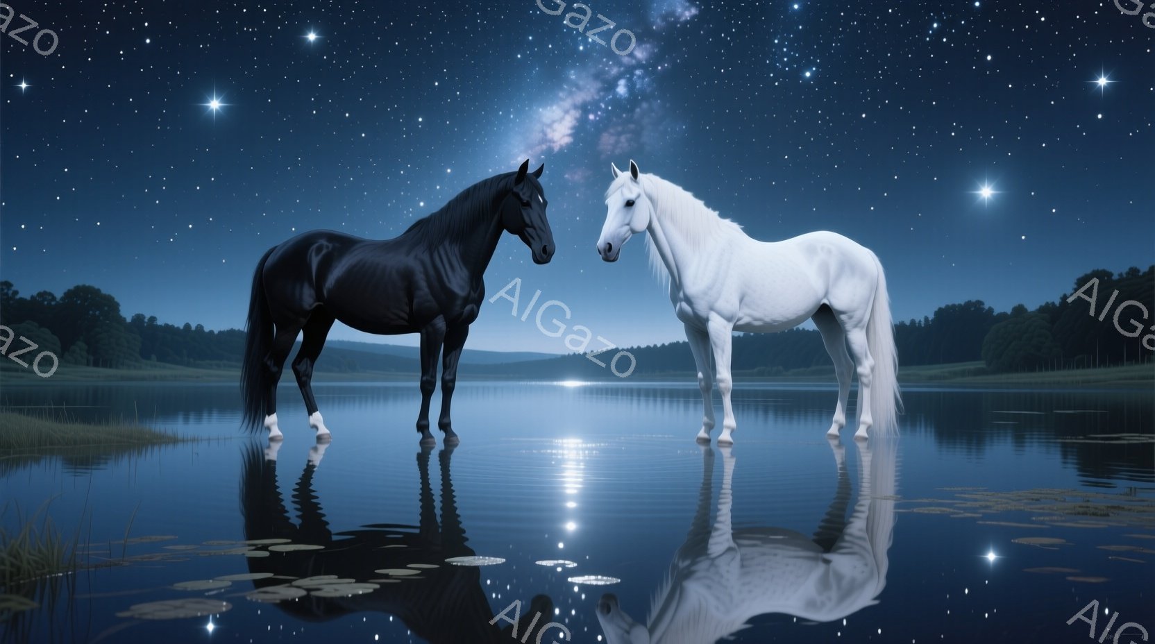 毛並みの良い黒と白の2匹のぬいぐるみ馬が写っています。馬たちは向かい合って立っており、白馬は金色のたてがみと尾を持ち、黒馬は濃い茶色の足元を持っています。背景は淡いベージュ色の布のようなもので、光が差し込み、温かく優しい雰囲気を醸し出しています。