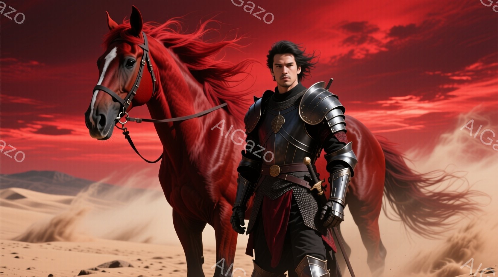 この無料AI生成画像「赤い外套を羽織った、金色の装飾が施された鎧を身につけた男性が、槍を構えて立っている。背景には燃え盛る戦場と煙が立ち込め、赤毛の馬が躍動的に駆けている様子が描かれている。全体的に、激しい戦闘と英雄的な雰囲気が漂う、力強いイメージである。」は、2025年10月25日に作成されました。 サイズは 1664×928px の高解像度で、商用利用も可能なフリー素材として提供しています。
