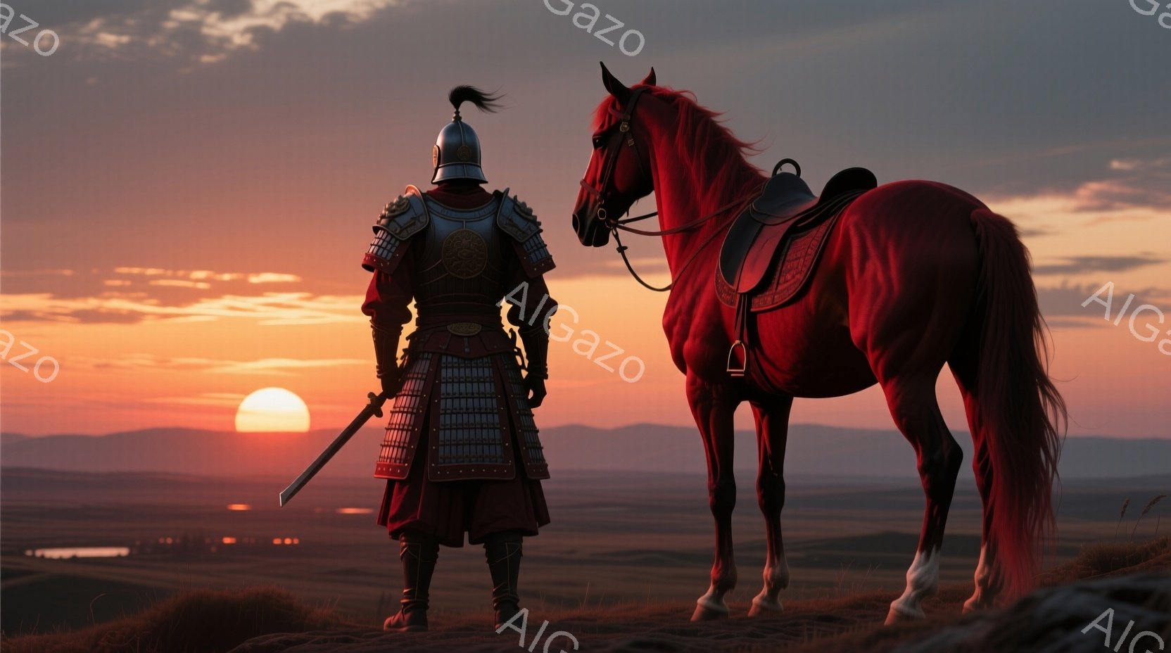赤い衣装を身にまとった武者が、夕焼けを背に草原に立っている。彼は全身に鎧を着用し、頭には特徴的な兜を被っている。その姿は凛々しく、背中に下げた刀が彼の武勇を表している。