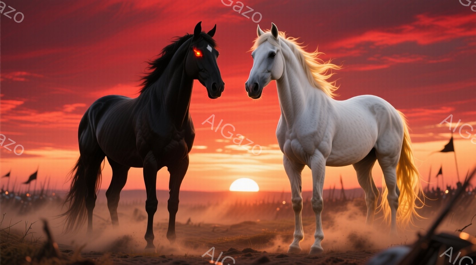 漆黒の馬と純白の馬が、夕焼けに染まる砂漠地帯で対峙している。両馬は前足を上げて歩を進め、力強い眼差しで互いを見つめ、その周囲には砂埃が舞い上がっている。背景には沈みゆく太陽と、遠くに見える旗のようなものがいくつかあり、厳かで緊張感のある雰囲気を醸し出している。