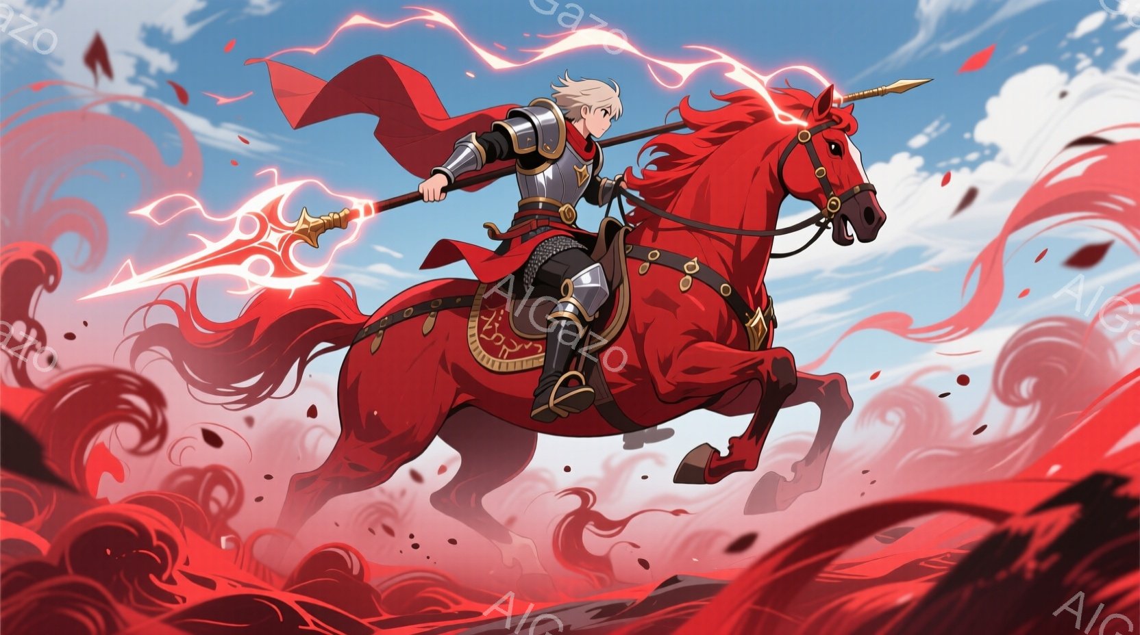 深紅の甲冑を身につけた武者が、黒い外套を羽織り、槍を構えています。背景には、多数の旗と、ぼやけた建物が見え、戦場のような雰囲気です。赤毛の馬が武者の隣に立ち、共に何かを臨んでいるような緊張感のある構図となっています。