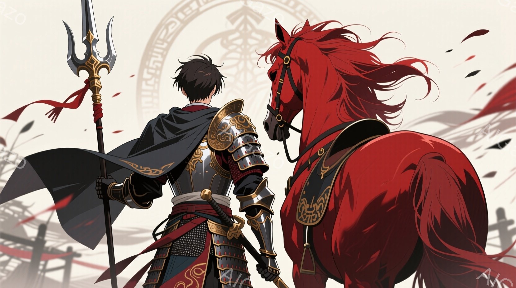 黒髪の男性戦士が、赤褐色の馬に並んで立っている。彼は、金色の装飾が施された黒い鎧を身に着け、赤いマントを羽織り、手に三叉の槍を持っている。背景には、ぼやけた旗と戦場のような風景が広がり、全体的に力強く、決意に満ちた雰囲気を醸し出している。