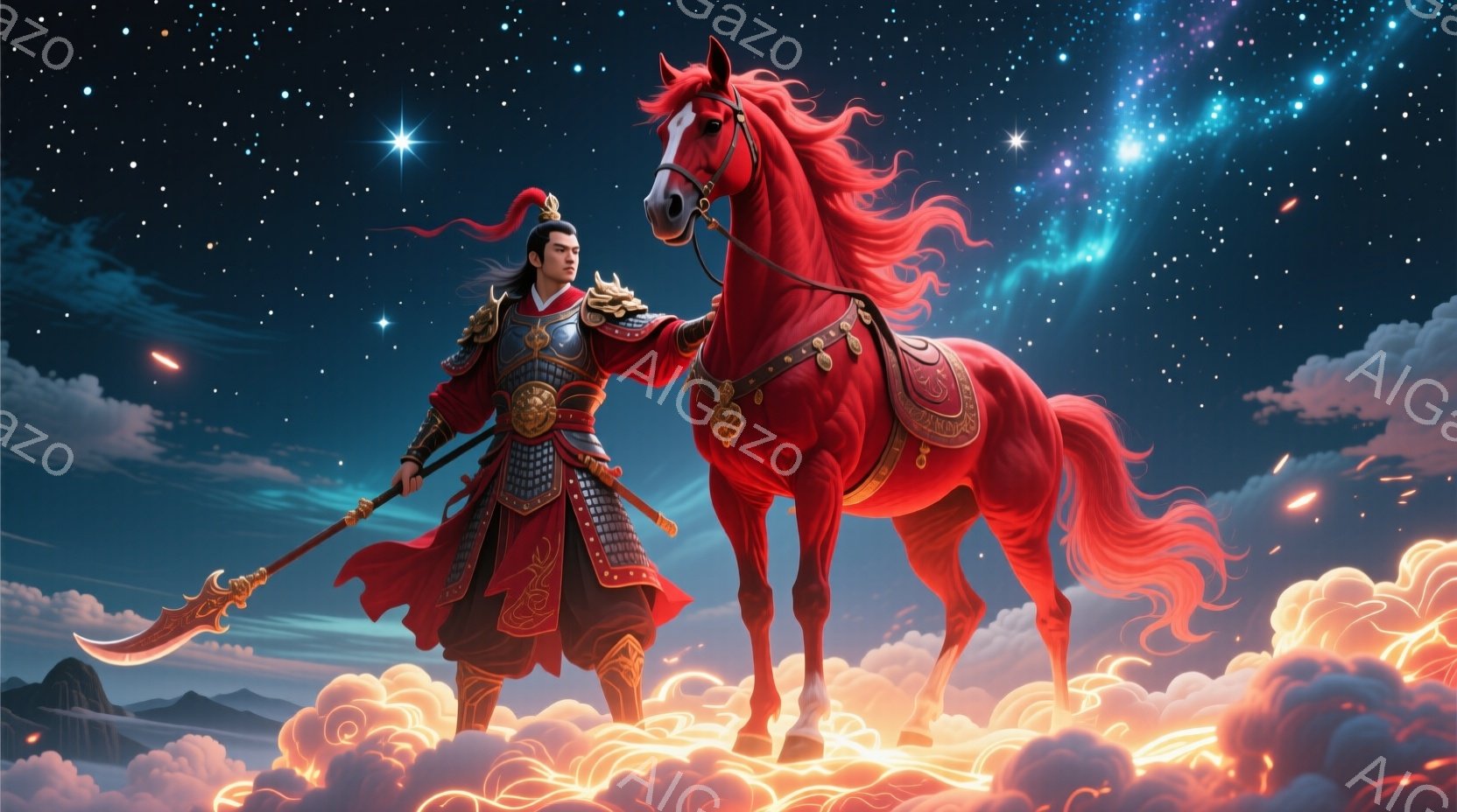 漆黒の髪を持つ男性が、金と黒の鎧を身に着け、赤い馬の隣に立っている。彼は背中に黒い布を羽織り、手に槍を持っている。背景には、ぼやけた旗や兵士らしき姿が見え、戦場の雰囲気が漂っている。