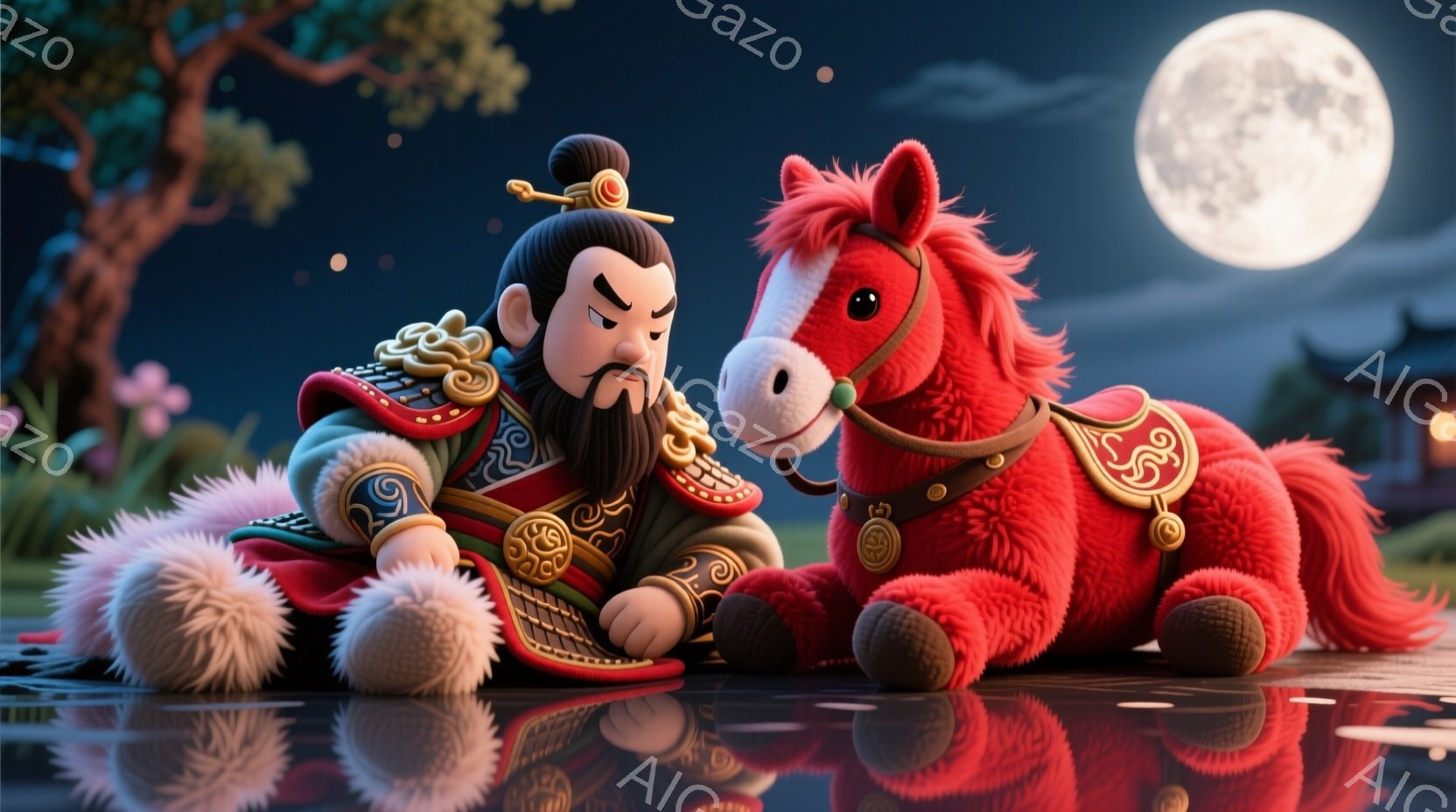 中国風の鎧を身につけた可愛らしい少年と、赤いぬいぐるみ馬が写っています。少年は黒髪を後ろで結い、眉を少しつり上げて凛々しい表情を浮かべており、鎧は緑と金色の装飾が施されています。背景には、夕焼け空と山々が広がり、暖かく穏やかな雰囲気です。