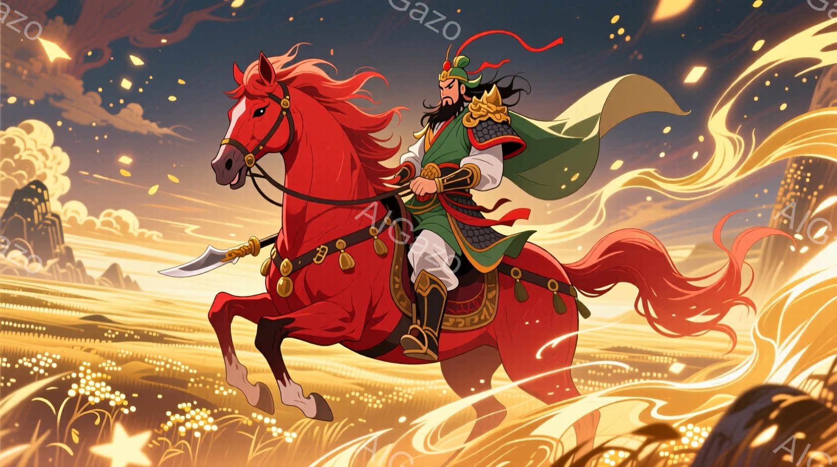 鮮やかな赤色の馬に乗った男性が描かれています。緑と赤の対照的な色彩の衣装を身につけ、顔には隈取のような模様があり、鋭い眼光で前を見据えています。背景には炎のようなエフェクトが広がり、躍動感と力強い雰囲気を醸し出しています。