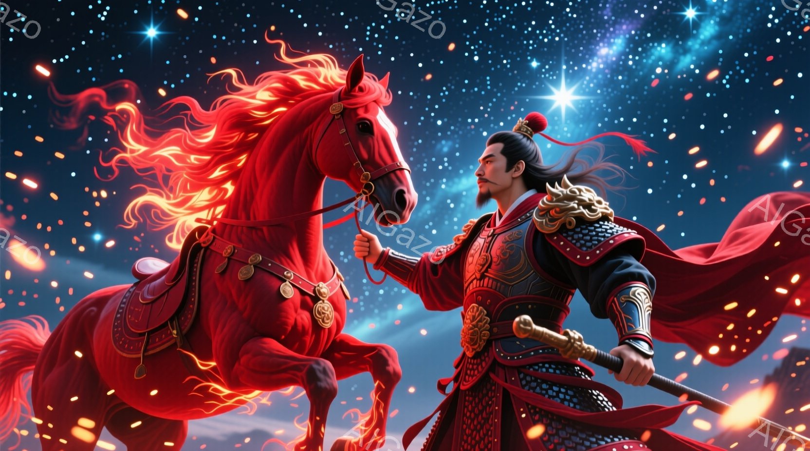 赤い装束を身につけた武人が、燃え盛るような赤い馬と共に描かれている。武人は黒髪を後ろで結い、鋭い眼光で何かを見据えているようだ。背景には暗雲と星が散りばめられ、燃え盛る馬と武人の姿が力強く、ドラマチックな雰囲気を醸し出している。