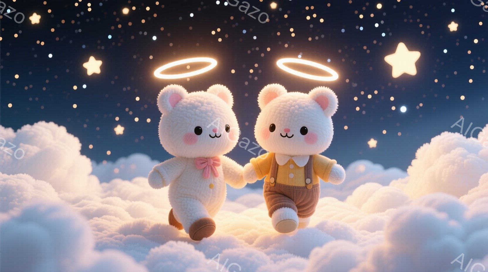 ふわふわとした白いクマと茶色いクマが、雲の上を並んで歩いています。二匹は天使の輪を頭に載せ、幸せそうな表情をしています。背景は夜空で、星がキラキラと輝いており、夢のような幻想的な雰囲気です。