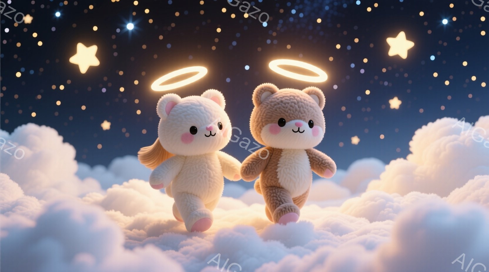 ふわふわの雲の上に座っている、ポニーテールで可愛らしい少女たちが二人描かれています。ピンク色の頬と優しい笑顔を持ち、暖かい雰囲気の白いパーカーを着ています。背景には星が輝き、雲と光る花が幻想的な夜空を彩っています。