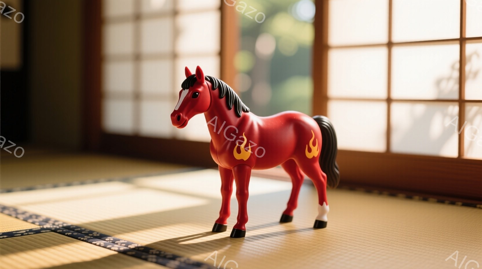 真っ赤な馬のおもちゃが畳の上に立っている。両肩には炎の模様が描かれており、黒い鬣と蹄が特徴的だ。背景には木製の障子と窓があり、柔らかい光が差し込み、穏やかな室内雰囲気を醸し出している。