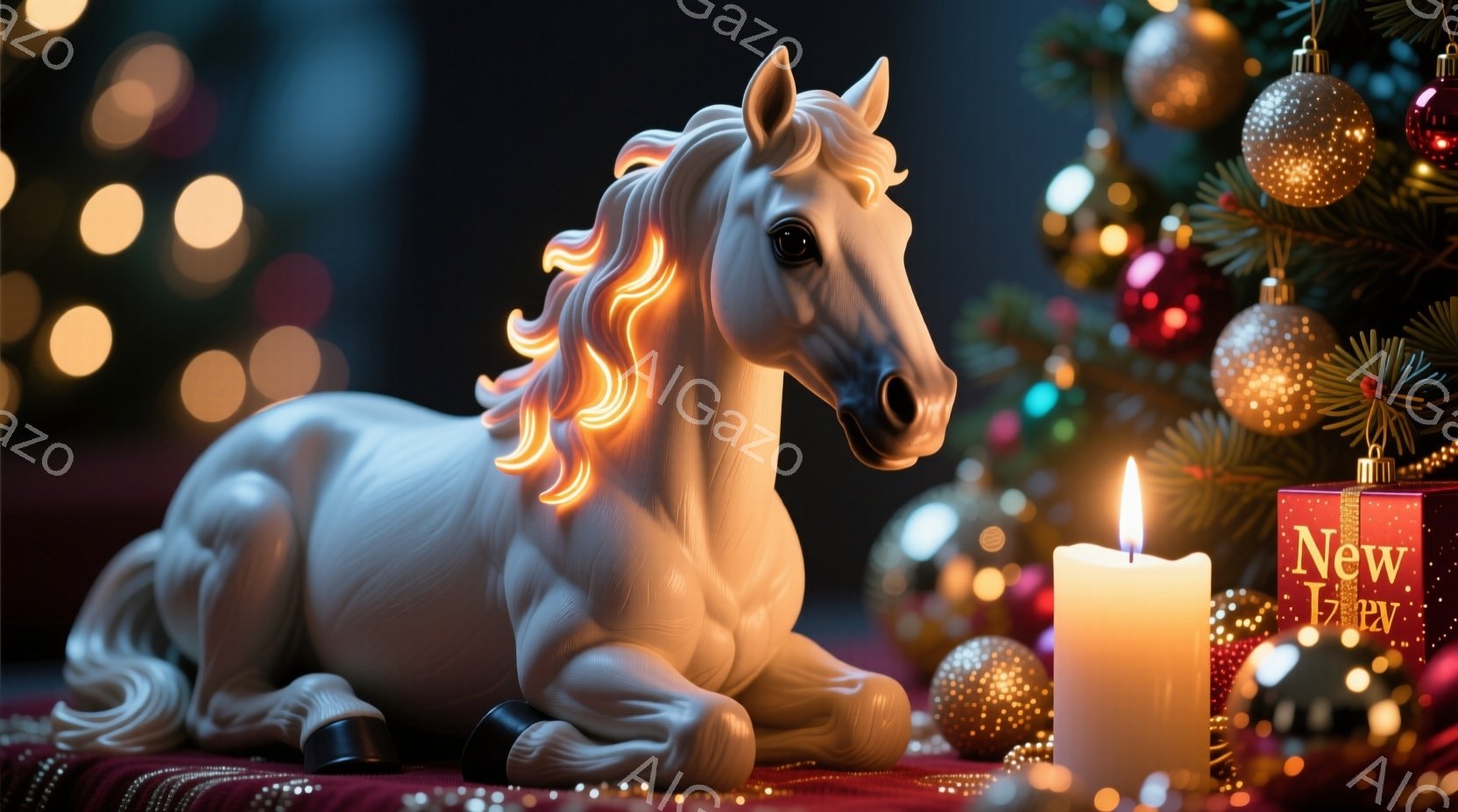 白いユニコーンのような彫像が、クリスマスツリーのオーナメントや光るキャンドルの間に置かれている。彫像は横たわっており、穏やかで優雅な雰囲気である。背景は暗く、ぼやけた光で満たされ、クリスマスの暖かく幻想的な雰囲気を醸し出している。