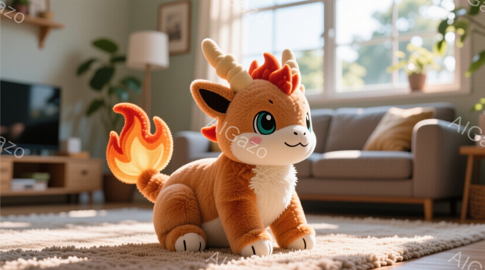 明るいリビングルームの中心に、オレンジ色の毛並みを持つかわいらしいぬいぐるみが座っています。特徴的なのは、炎のような形をした尾と、ほっぺにうっすらとピンク色のチークが入っていることです。背景には、ベージュ色のソファや木製の棚があり、温かく穏やかな雰囲気が漂っています。