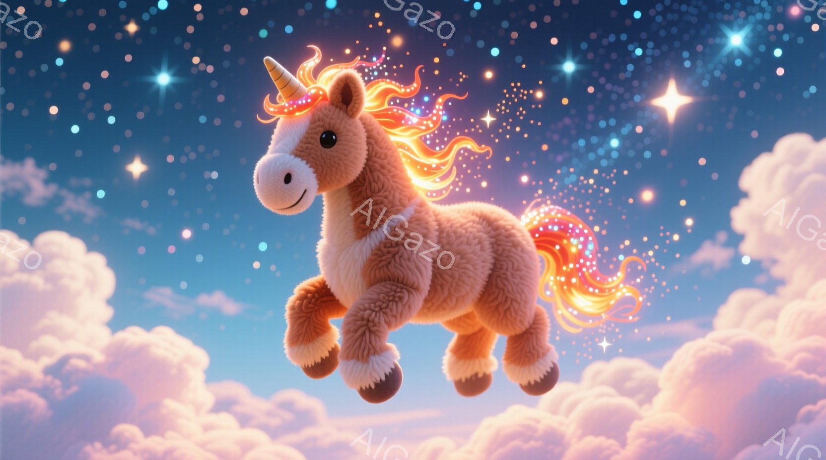 白いユニコーンが雲の上を軽やかに飛んでいる姿が描かれています。たてがみと尻尾は炎のようなオレンジとピンクのグラデーションで、きらきらと輝いています。背景はパステルカラーの雲と星空で、夢のような幻想的な雰囲気を醸し出しています。