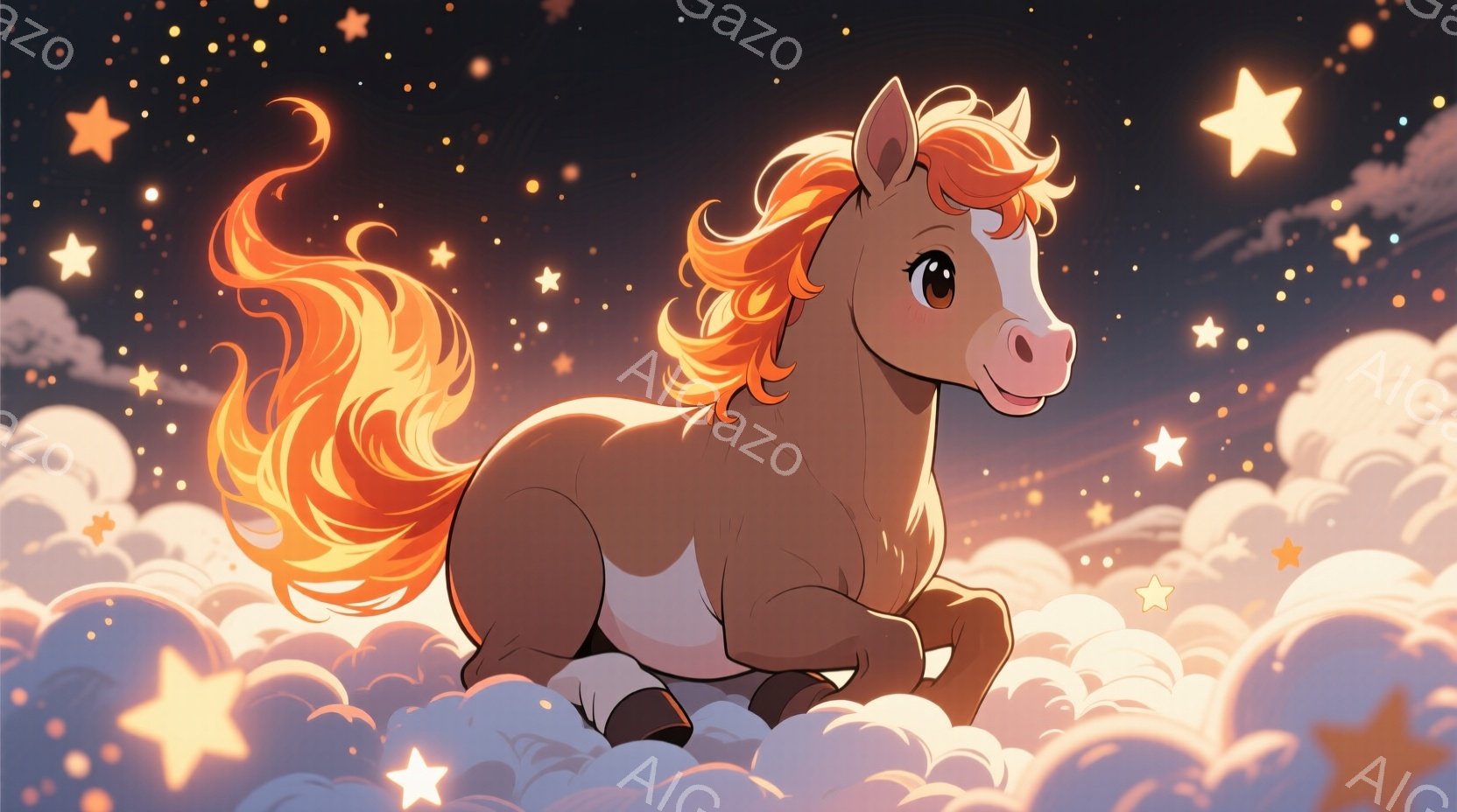 明るい茶色の馬が雲の上を駆け抜けている姿が描かれています。たてがみと尾は燃えるようなオレンジ色で、表情は穏やかで楽しそうです。背景には無数の星とふわふわとした雲が広がり、夢のような幻想的な雰囲気を醸し出しています。