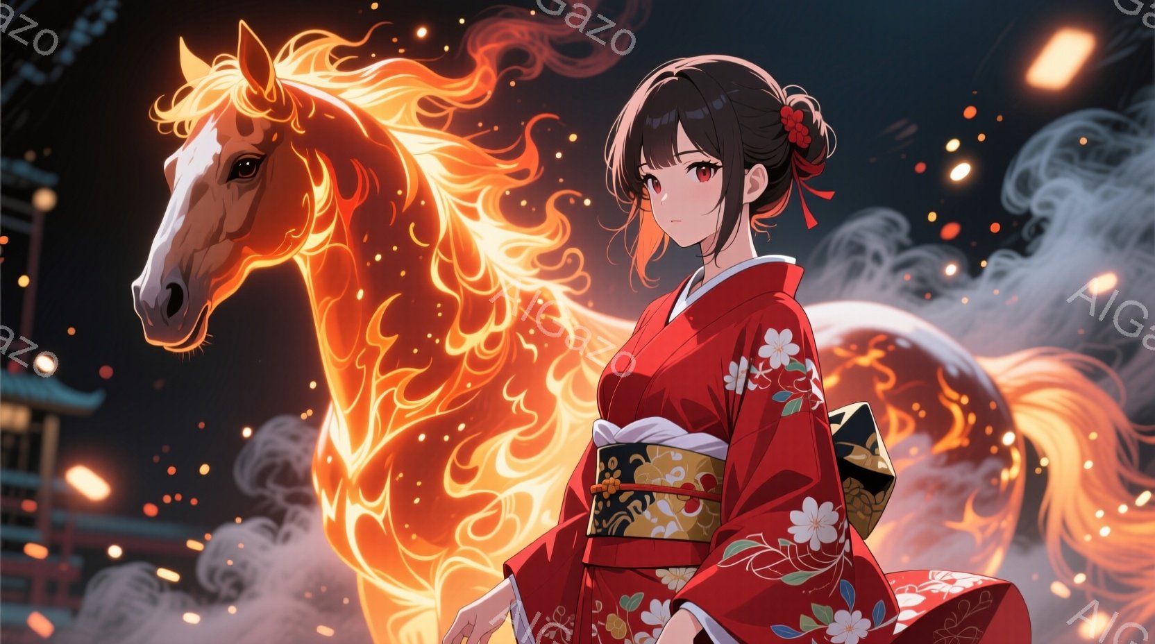 深紅色の着物を着た女性が、炎のように輝く馬に寄り添っている。彼女は黒髪をまとめ、片側に白い花飾りをつけており、穏やかな微笑みを浮かべている。背景には、暗い夜空に浮かび上がる寺院と、舞い上がる火花が描かれ、幻想的で神秘的な雰囲気を醸し出している。